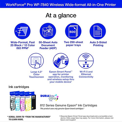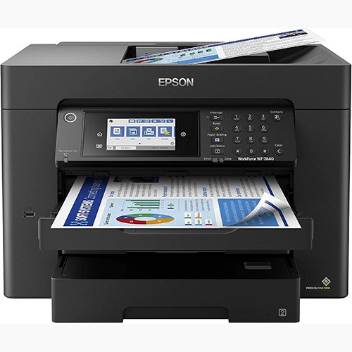 - Print, copy, scan and fax all from 1 machine with this Epson WorkForce Pro WF-7840 Wireless All-in-One Color Printer. The printer is capable of delivering wide-format prints up to 13″ x 19″, while the PrecisionCore Heat-Free technology helps produce printouts quickly. The DURABrite Ultra ink dries quickly to ensure smudge-free results, and the 500-sheet capacity is built to meet the demands of your office.
