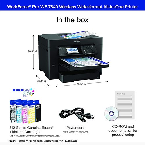 | Included Components | WorkForce Pro WF-7840 printer, quick setup guide, CD-ROM with drivers, power cord, 4x DURABrite Ultra Ink cartridges (1x Black ink cartridge and 3x color ink cartridges: 1x Cyan, 1x Magenta, 1x Yellow) |